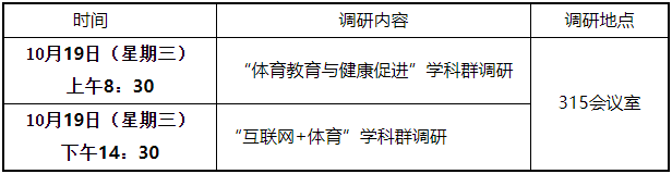 为实施《武汉体育学院“十三五”学科(群)建设实施规划》,推动学校学科建设快速发展,明确学科发展目标,促进“体育教育与健康促进”和“互联网+体育”两个学科群的发展,学校将召开学科群建设调研会,现将会议具体安排通知如下:
